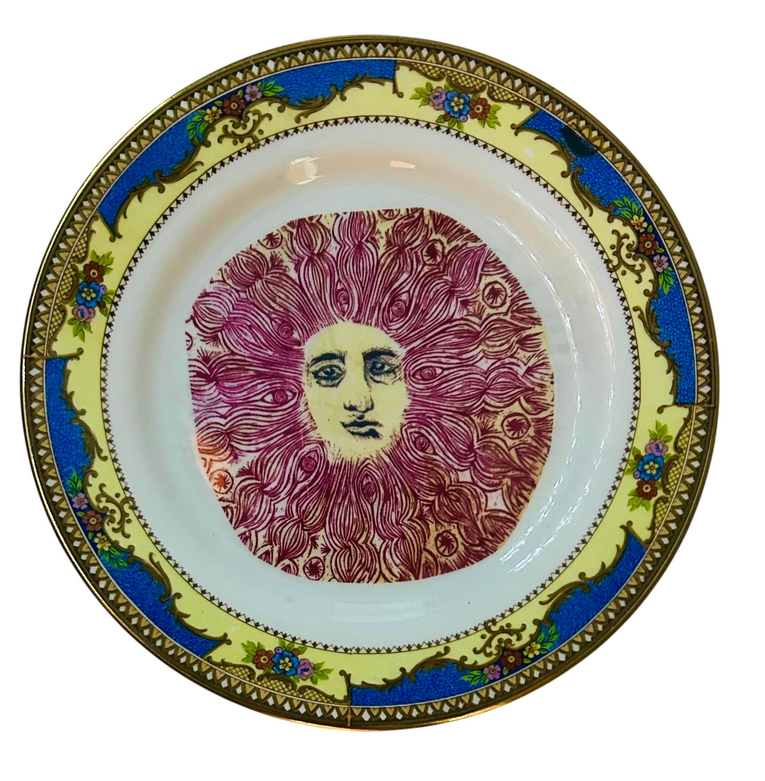 Blue and Yellow trim Plate with Red Sun Print